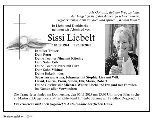 Sissi, wie sie von allen nur gerufen wurde, Mutter von Nina Schwarz und Oma von Sebastian, Johannes und Lisa, war die erste Jugendtrainerin, die über 25 Jahre das Volleyball in Deggendorf aufgebaut hatte. Sie ist kurz vor ihrem 81. Geburtstag im Deggendorfer Klinikum eingeschlafen. Es trauern um sie ihr Mann Peter, ihre vier Kinder Nina, Erik, Petra und Michael und ihre 10 Enkelkinder: