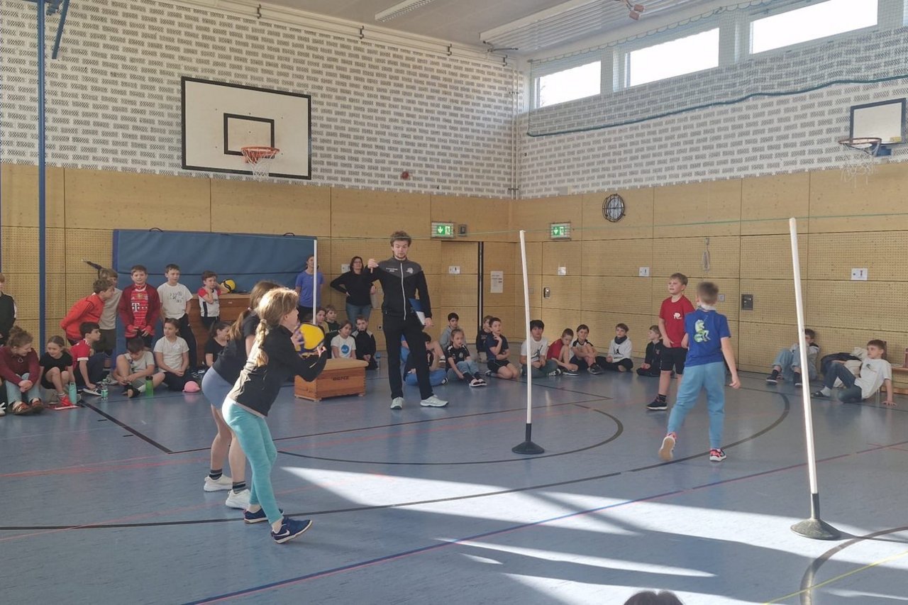 Besondere Motivation brachte auch dieses Jahr Simon Klebel von den Lechrain-Volleys mit. Mit einem vorherigen Schnuppertraining in allen Klassen weckte er bei vielen Kindern die Begeisterung für Volleyball, die sie in den darauffolgenden Sportstunden weiter ausbauen konnten.