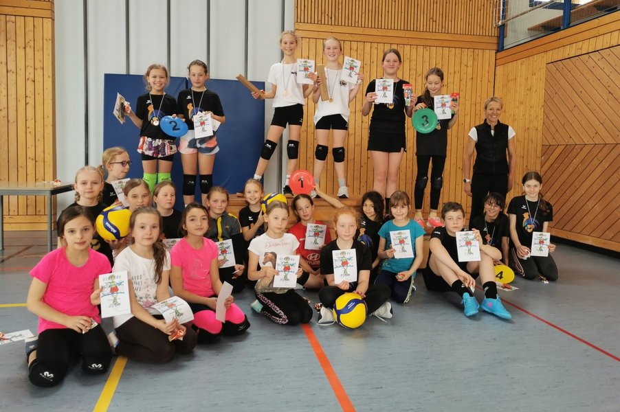 In Zweierteams fanden neben erfahrenen Volleyballer*innen auch ein paar Kinder, die sich dem Sport das erste Mal stellten, zusammen. Letztere wurden prima von ihren routinierten Klassenkamerad*innen unterstützt und motiviert. Unter der Leitung von Elisabeth Lederer, Trainerin des SV Hahnbach, mit dem die Grundschule eine Sportarbeitsgemeinschaft hat und Susanne Gebhardt (Sportfachberatung) spielten die Kinder nach vereinfachten Volleyballregeln in 2 getrennten Gruppen jeder gegen jeden. Anschließend kam es zu den Entscheidungskämpfen der einzelnen Gruppensieger. Hier belegten die „Volley Stars“ (Mathilda Möller, Leni Rudert, Klasse 4a) den 1. Platz. Sie verwiesen die Teams: „Volley SVH“ (Lena Münch, Theresa Trummer, Klasse 4a) und „Cupcakes“ (Anja Dotzler und Melina Phillips, Klasse 3b) auf die Plätze 2 und 3. Den 4. Platz belegten die „schnellen Hühner“ (Lea Prüll und Felicitas, Klasse 4b).